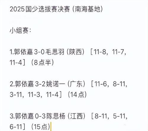 在2025乒乓球國(guó)少選拔賽中,奧運(yùn)冠軍王楠的女兒郭依嘉又一次在和陳思楊的交手中落敗。郭依嘉3次碰上陳思楊都落敗。陳思楊則連續(xù)3年入選國(guó)少集訓(xùn)隊(duì),并且在繼2024年奪冠之后,再次殺進(jìn)決賽,將沖擊兩連冠。