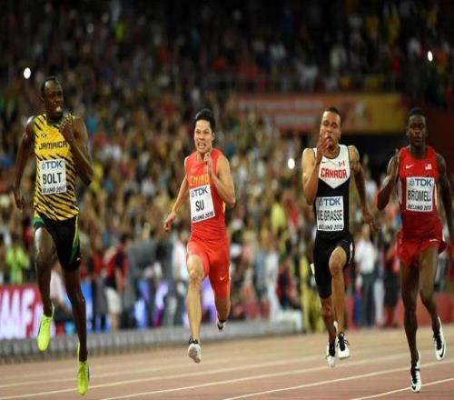 2015年8月23日,蘇炳添(左二)與博爾特(左一)在世界田徑錦標(biāo)賽男子100米半決賽中。蘇炳添以9秒99的成績晉級決賽。新華社記者 李鋼 攝