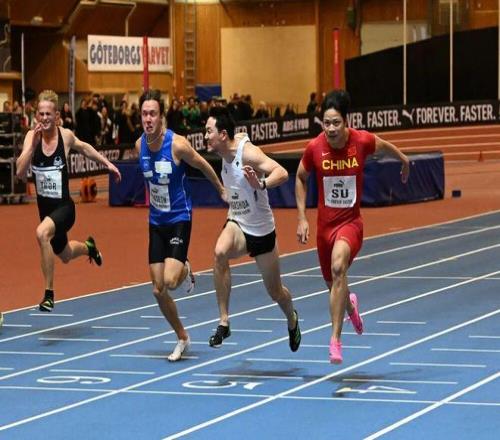2023年2月2日,蘇炳添(右一)在世界田聯(lián)室內(nèi)巡回賽男子60米A組決賽中。新華社發(fā)
