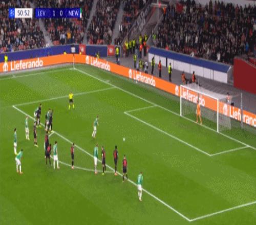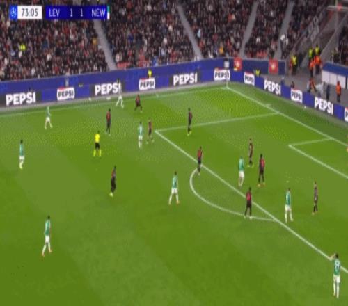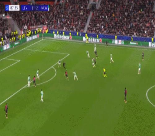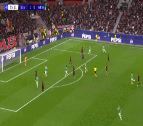 第88分鐘,馬扎助攻,格里馬爾多插射破門扳平比分,勒沃庫(kù)森2-1紐卡